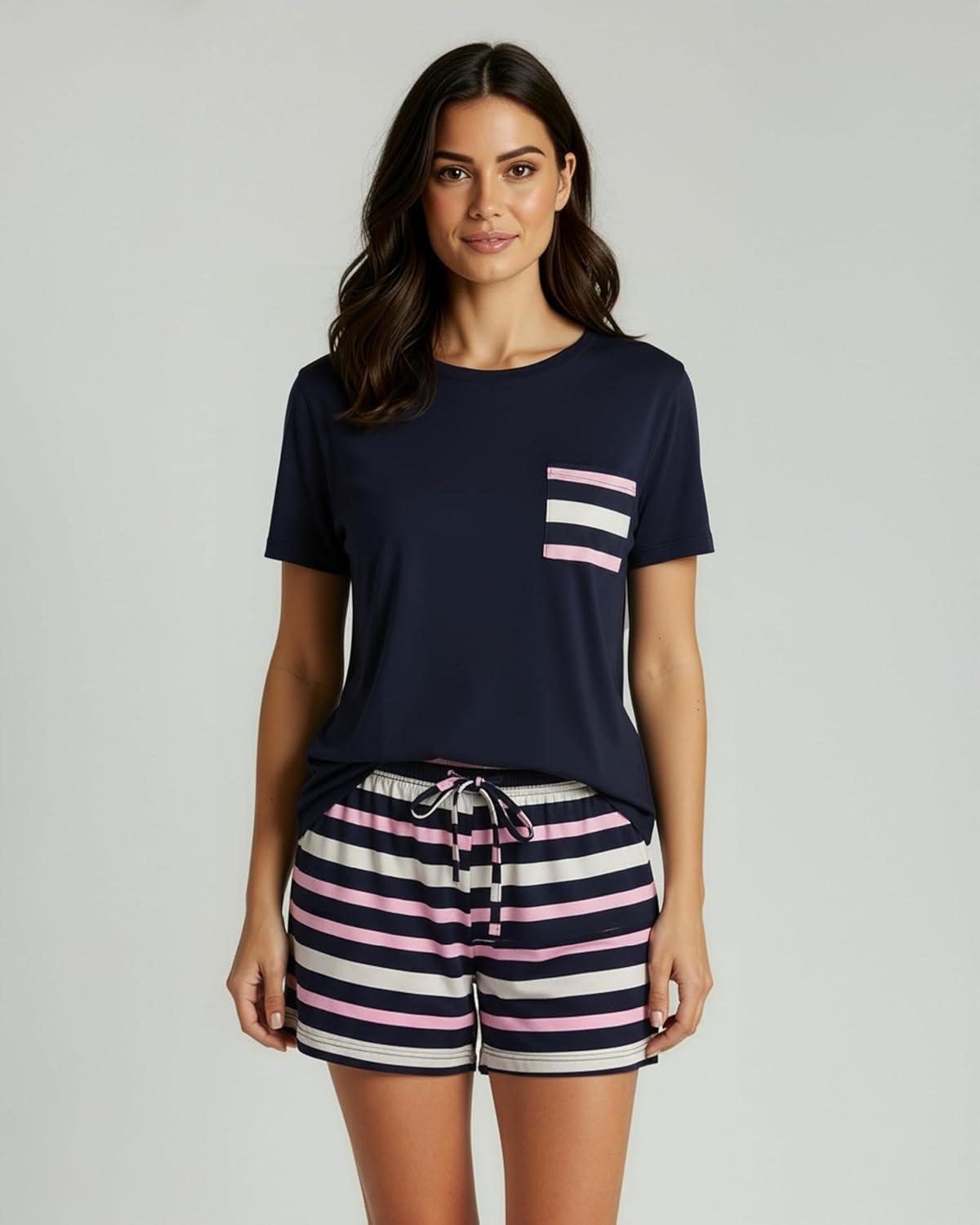 imageReal Essentials 2 Pack Womens Short Sleeve Pajama Short Set  Comfy Lightweight Soft Lounge Sleepwear PlusSet 5