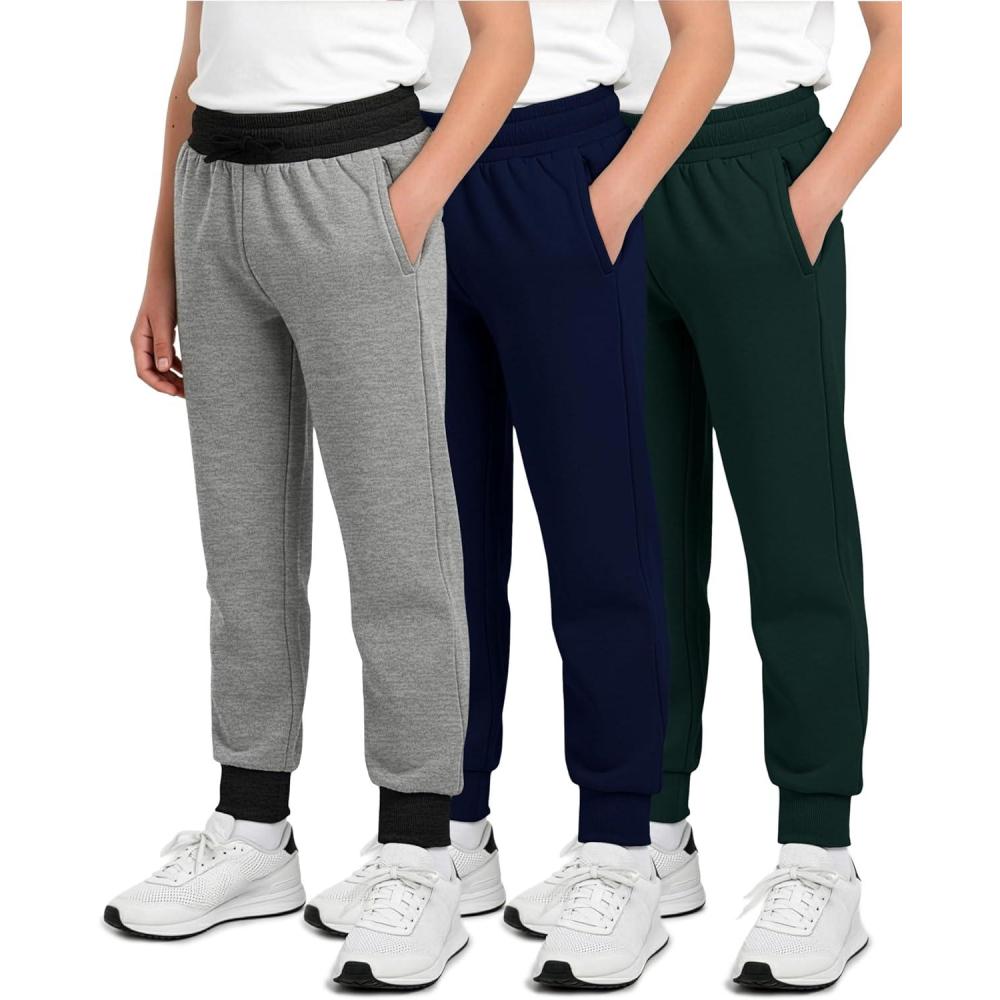 Real Essentials 3 Pack: Boys’ Cotton Fleece Jogger Sweatpants – Active Athletic Youth Pants for Teens with Pockets(Set K)