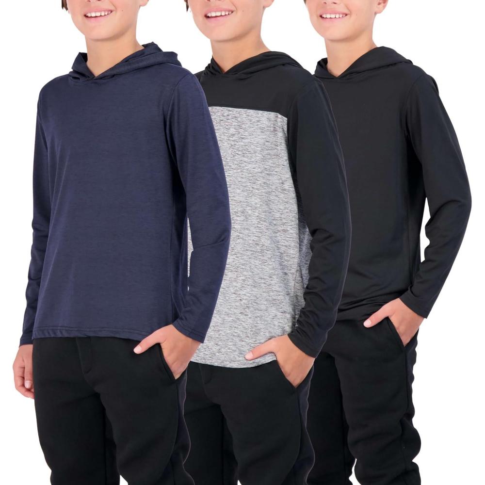 Real Essentials 3 Pack: Dry-Fit Youth Boys Teen Active Long Sleeve Hoodie Sweatshirts – Hooded Pullover Shirts(Set K)