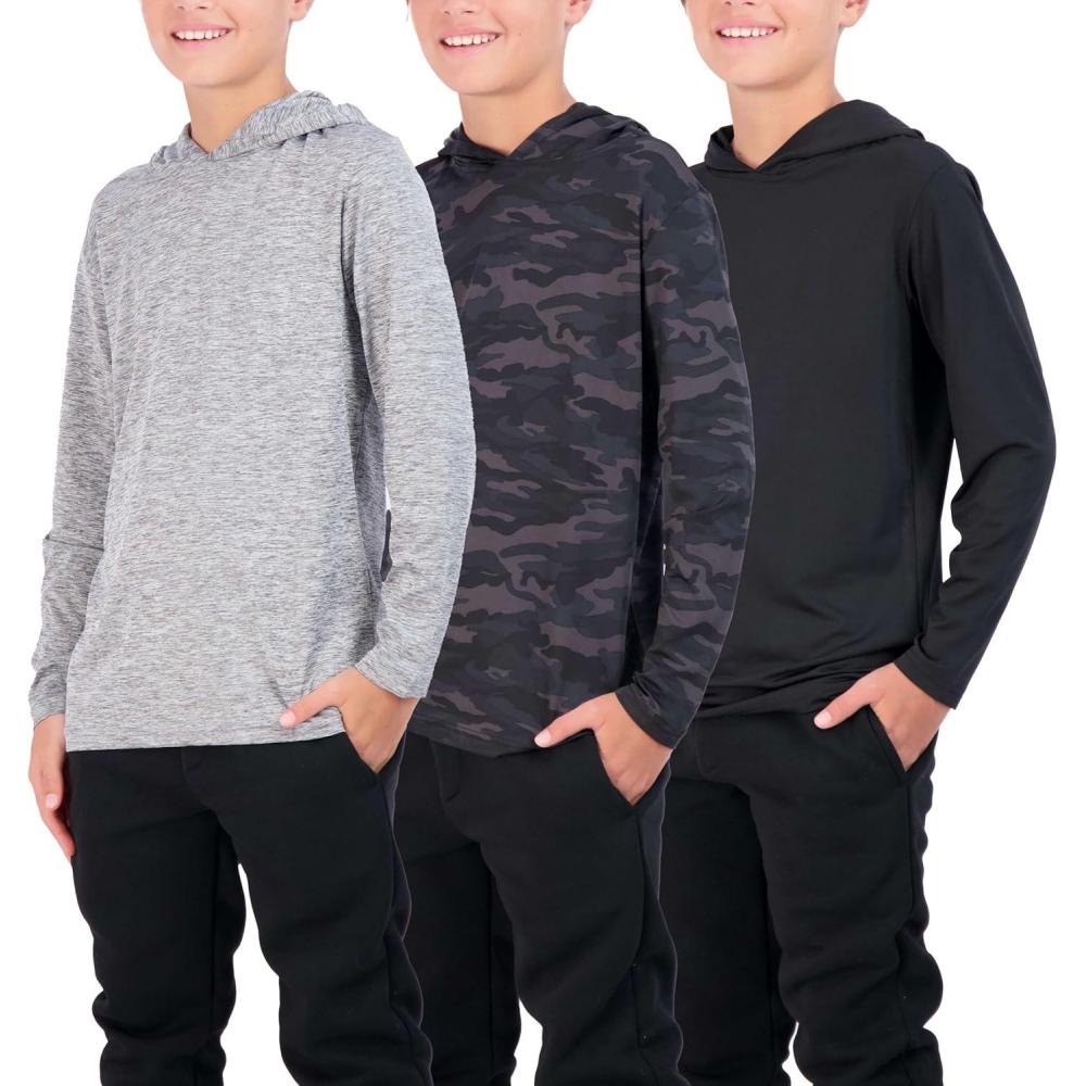 Real Essentials 3 Pack: Dry-Fit Youth Boys Teen Active Long Sleeve Hoodie Sweatshirts - Hooded Pullover Shirts(Set E)