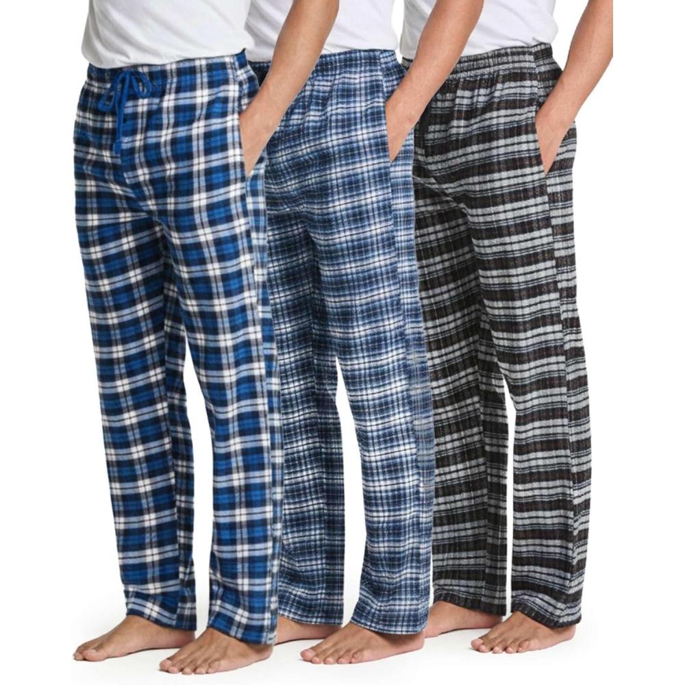 Real Essentials 3 Pack: Men’s Soft Cotton Flannel Pajama Pants PJ Lounge Bottoms Elastic Waist Pockets (Big and Tall)(Flannel Set 1)