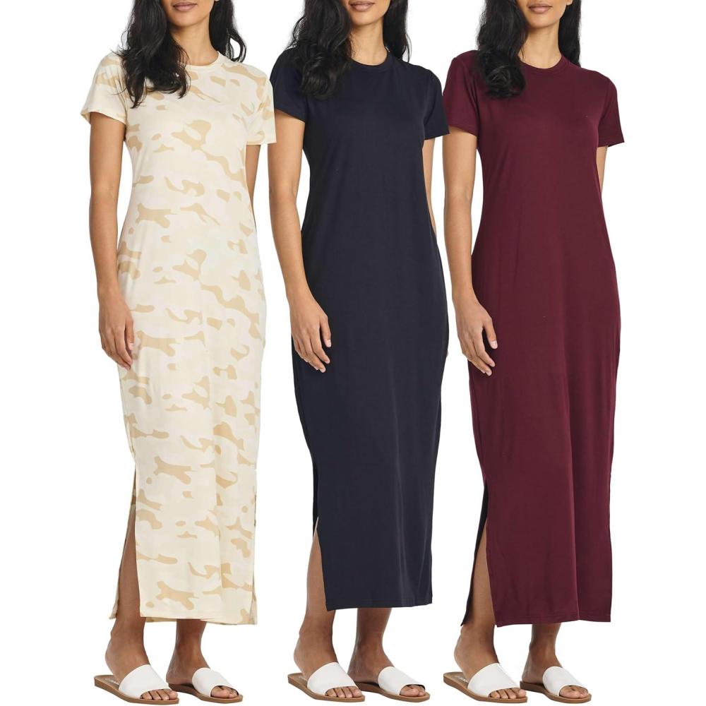 Real Essentials 3 Pack Women’s Casual Short Sleeve Maxi T-Shirt Summer Dress with Slit (Available in Plus Size)(Set 3)