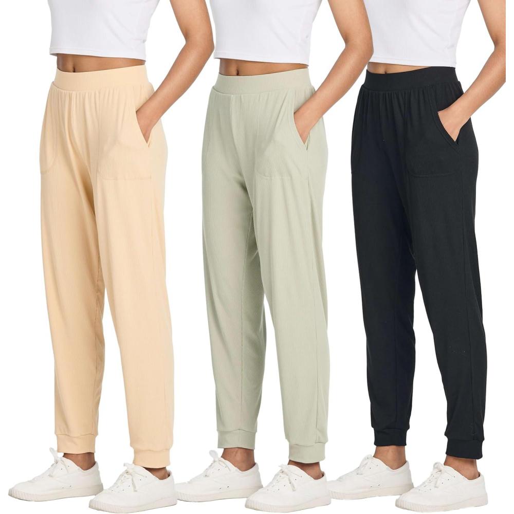 Real Essentials 3 Pack: Women's Ribbed Lounge Jogger Casual Pants Cuffed Sweatpants with Pockets (Available in Plus)(Set 7)