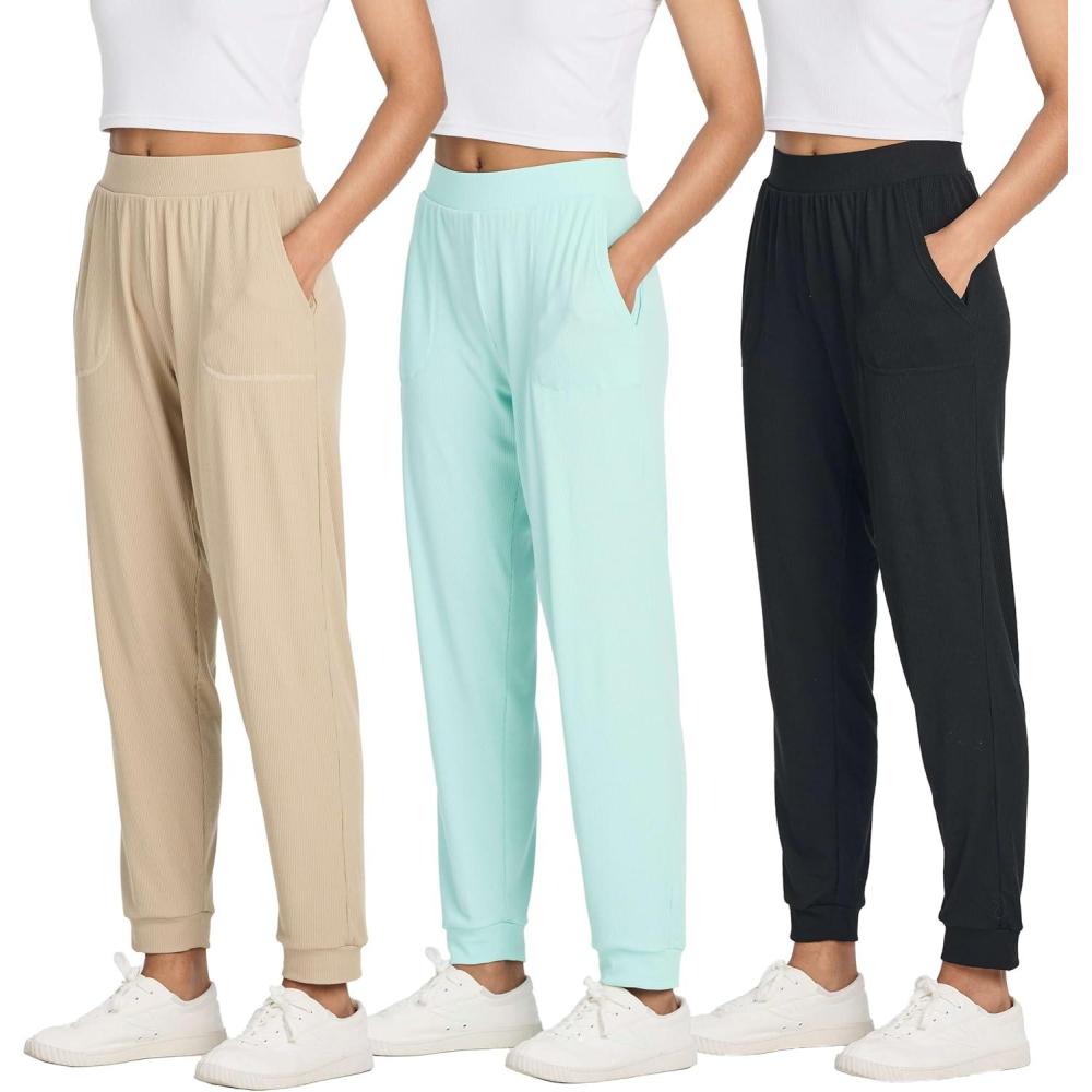Real Essentials 3 Pack: Women's Ribbed Lounge Jogger Casual Pants Cuffed Sweatpants with Pockets (Available in Plus)(Set 8)