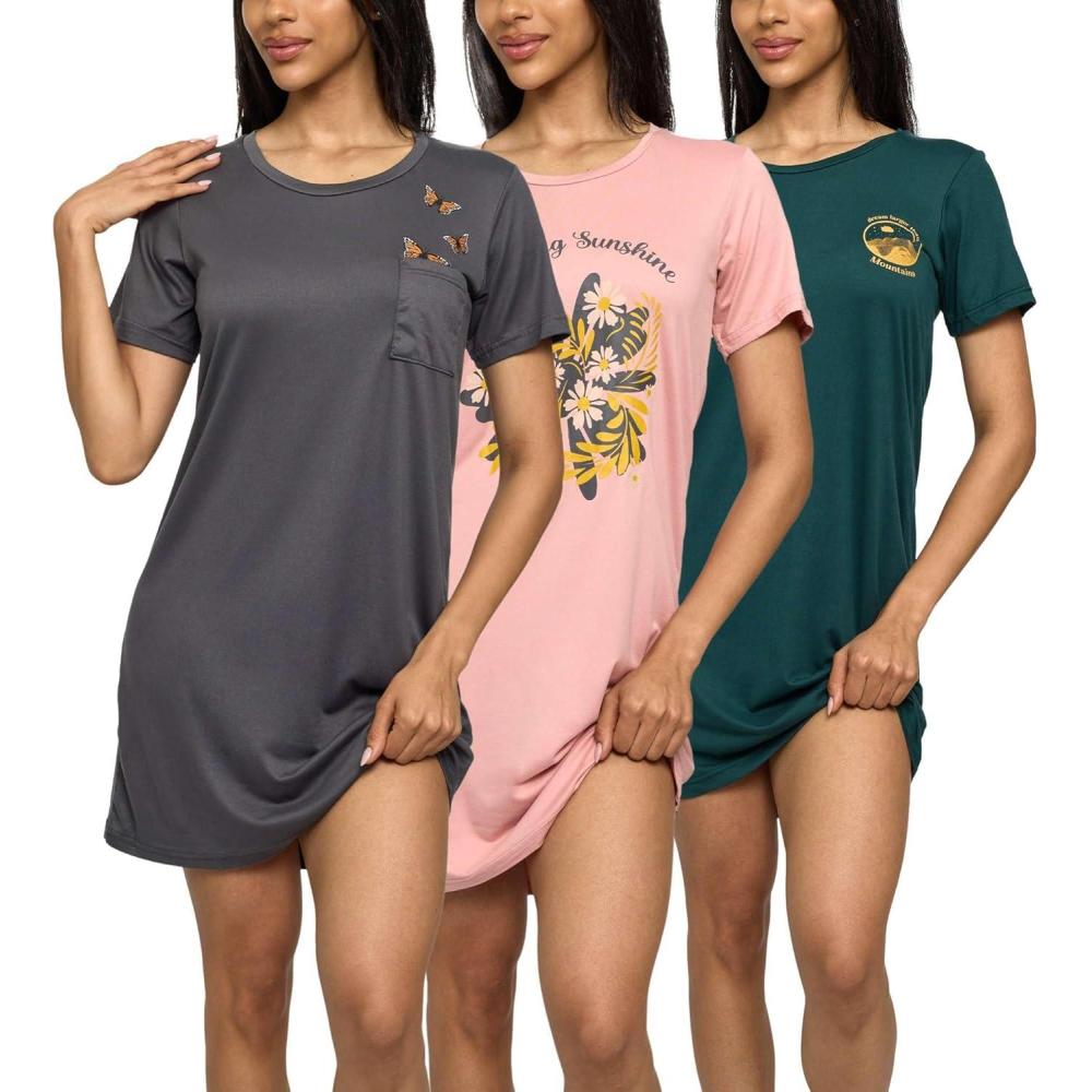 Real Essentials 3 Pack: Women's Short Sleeve Nightgown Dress – Nightshirt Pajama Sleep Shirt Sleepwear (Available In Plus)(Set 4)