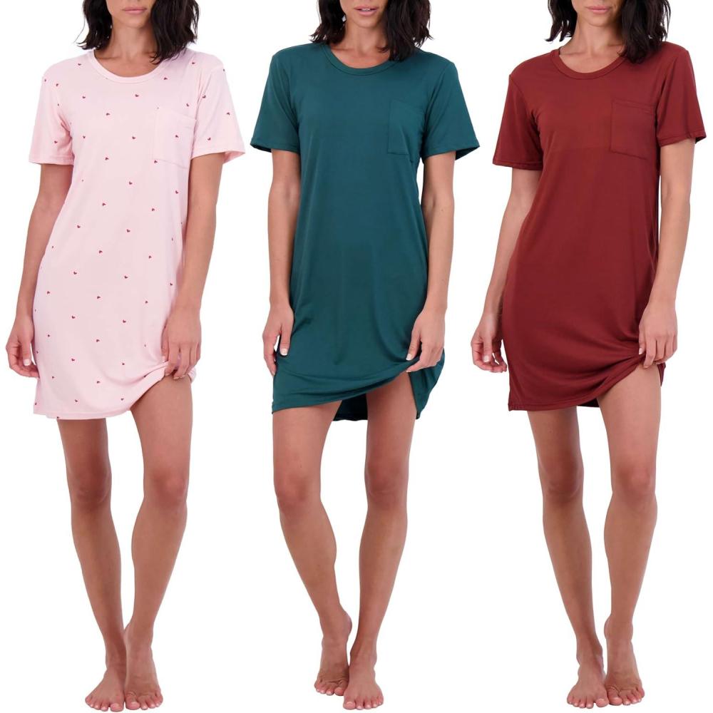Real Essentials 3 Pack: Women’s Short Sleeve Nightgown Dress – Nightshirt Pajama Sleep Shirt Sleepwear (Available In Plus)(Set E)