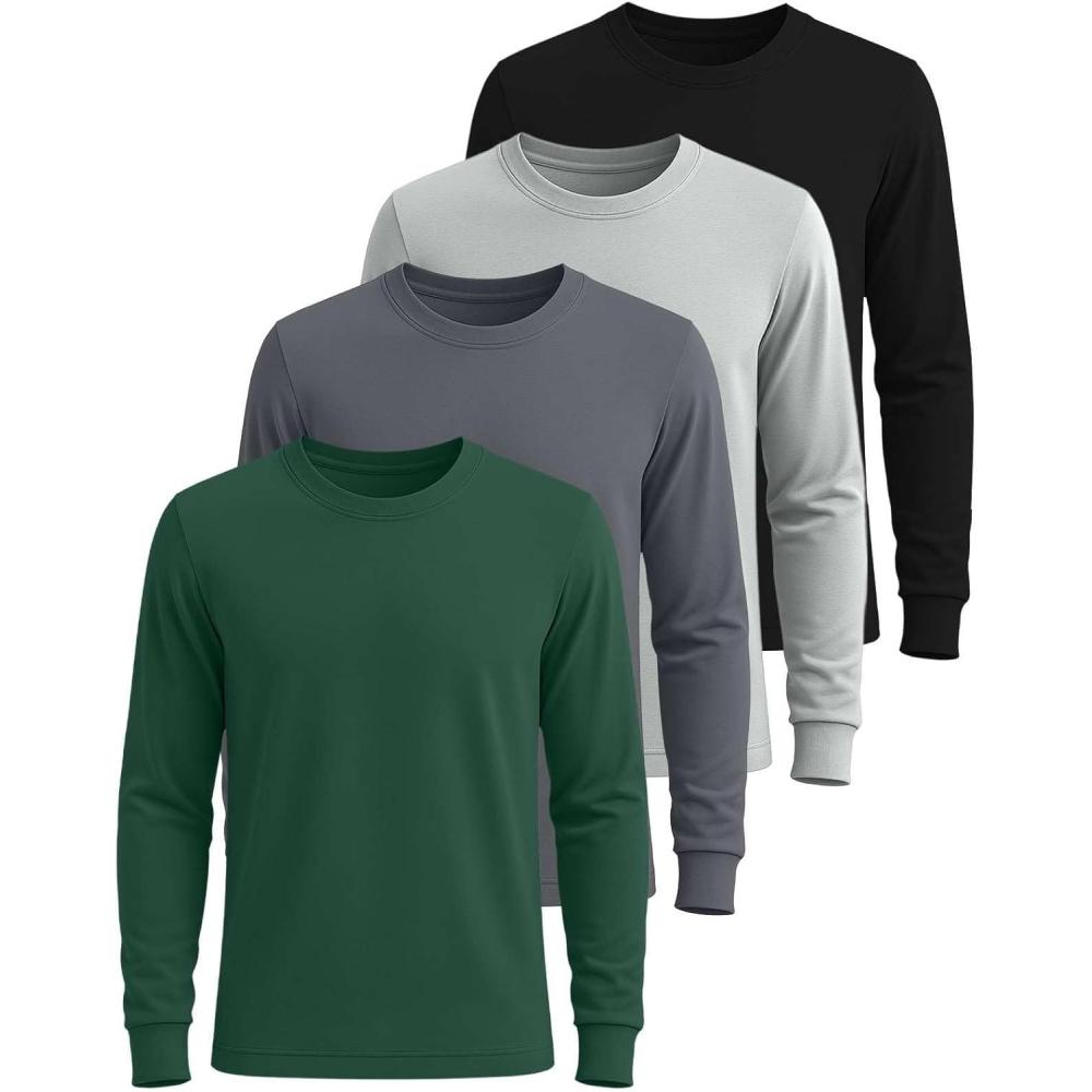 This 4 pack of men's long sleeve crew neck shirts is made from cotton for a soft and breathable feel that adapts well to fall and winter conditions. The relaxed fit allows natural movement during warmups, stretching, walking, and everyday activity, while remaining comfortable during work hours and off-duty time. The fabric provides steady comfort across varying temperatures, making these shirts useful for both indoor and outdoor routines. The long sleeves offer balanced coverage for cooler days, and the classic crew neck keeps the style clean and familiar. These shirts can be worn as a standalone layer or used as a comfortable undershirt beneath work jackets, hoodies, or cold-weather gear. The bulk multipack includes essential colors such as black, white, and grey, making weekly rotation simple and consistent for work, casual wear, gym use, or travel. Reliable for light workouts, jogging, cool-weather warmups, daily tasks, yard work, or relaxed weekends, this set supports an active lifestyle throughout fall and winter. Designed for ease of movement and steady comfort across changing conditions, these shirts function as dependable everyday basics. playera manga larga para hombre, camisetas para hombre, camisas de trabajo, ropa de invierno, playeras manga larga hombres