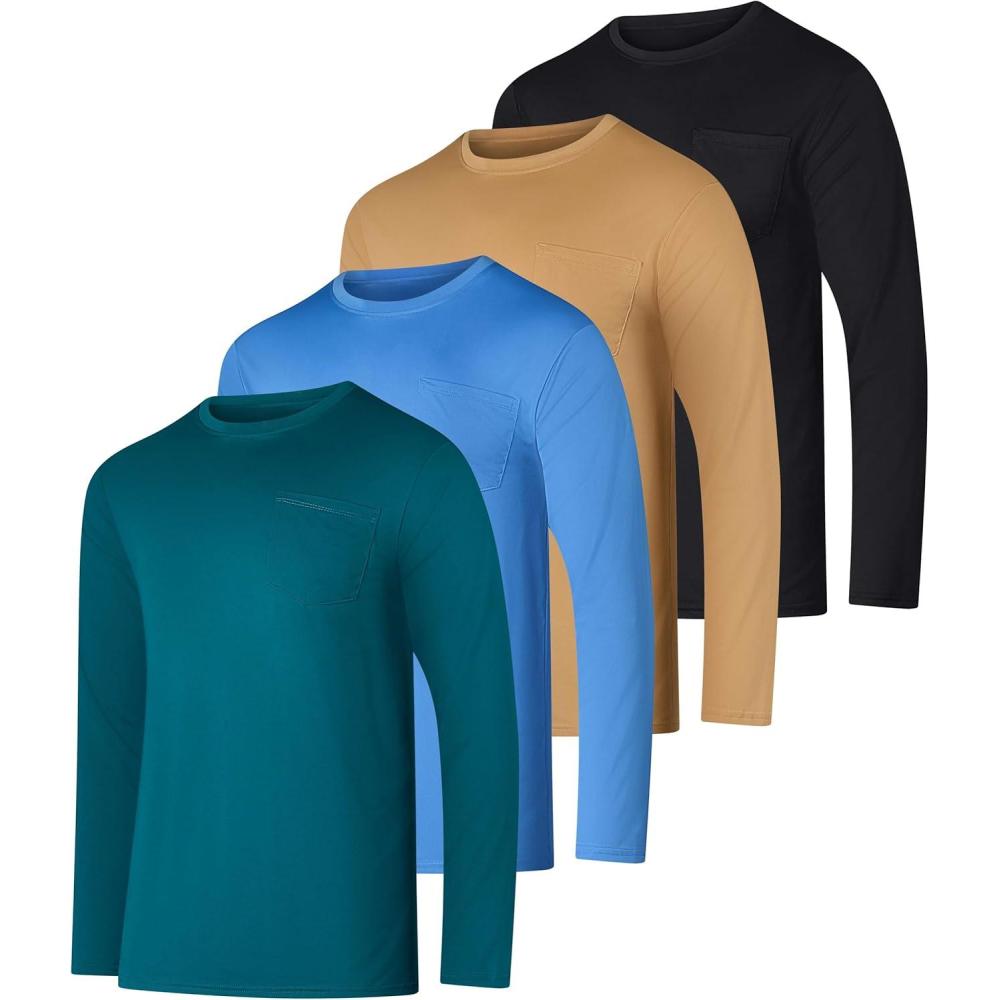 Real Essentials 4 Pack: Men’s Dry-Fit Active Athletic Long Sleeve Pocket Crew T-Shirt Outdoors UPF 50 (S-5XLT)(Set 4)