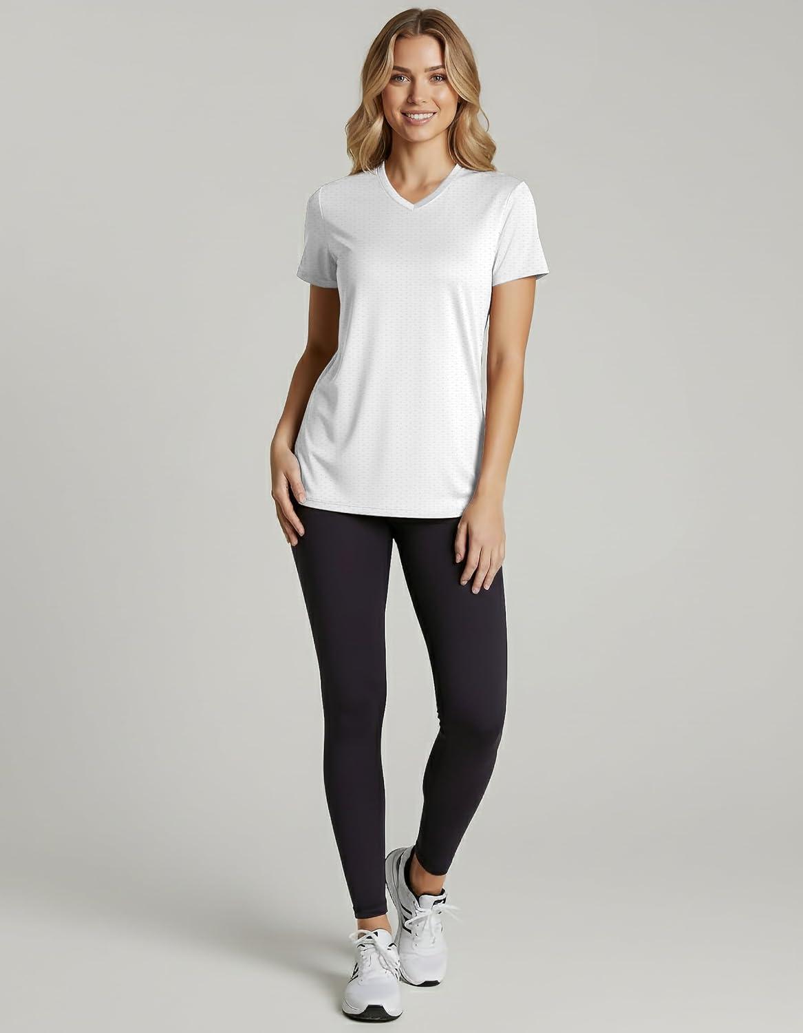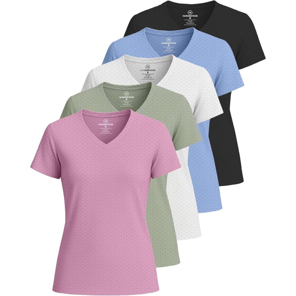 Upgrade your active wardrobe with the Real Essentials 5 Pack Short Sleeve Breeze Tech V-Neck T Shirts, the perfect balance of performance, comfort, and everyday style. Designed as versatile workout tops for women, these t shirts / tshirts are made from lightweight, moisture-wicking dry fit fabric that keeps you cool and dry through running, yoga, gym workouts, hiking, or any exercise routine. With a flattering v-neck design and loose yet sporty fit, these women’s t-shirts deliver the comfort of basic tees with the performance of premium athletic shirts. The breathable, quick-dry fabric ensures all-day freshness, making them ideal for both athleisure wear and active lifestyles. Whether you’re looking for ladies sports tops, fitness basics, or casual everyday t-shirts, this set has you covered. Each 5 pack multipack includes durable plain activewear tops that are easy to mix and match, giving you unbeatable value. Available in a wide range of colors including classic white, black, and trendy sporty shades, plus sizes from regular to plus, these women’s v-neck workout tees are the ultimate addition to your collection of loose-fit sets, quick-dry tops, and breathable basics. Stay stylish, comfortable, and ready for anything with Real Essentials women’s Breeze Tech V-Neck Dry Fit T Shirts — the go-to choice for work out sessions, fitness routines, and everyday wear.