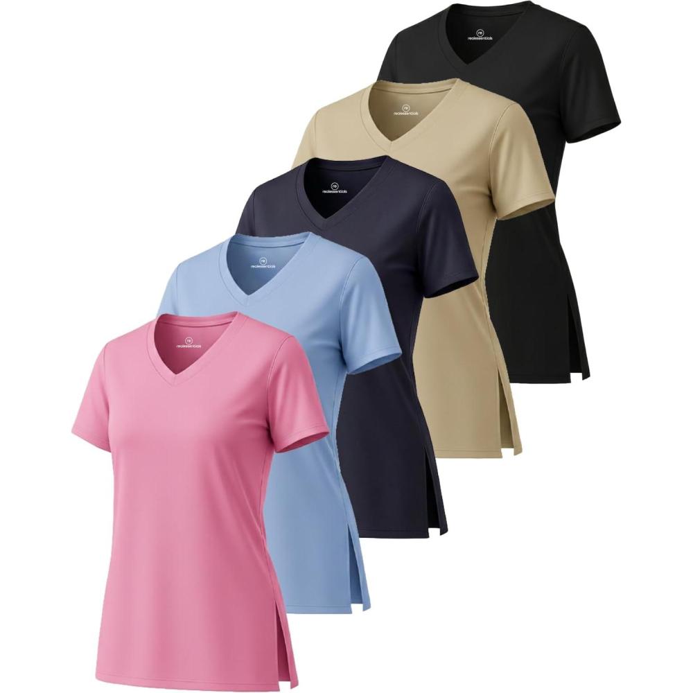 Upgrade your wardrobe with the Real Essentials 5 Pack: Ladies Short Sleeve Split Hem V-Neck Shirts — the perfect mix of women’s tops, workout T-shirts, and everyday activewear. Designed with moisture-wicking, quick-dry polyester fabric, these short sleeve V-neck tees keep women cool, dry, and comfortable during gym workouts, yoga, pilates, running, tennis, hiking, pickleball, zumba, or casual summer wear. The split hem and V-neck design provide a flattering, feminine fit that’s breathable, lightweight, and stylish. These versatile women’s shirts are perfect for athleisure, professional casual outfits, or layering with leggings, joggers, jeans, or shorts. Each value pack includes five cute, plain athletic T-shirts in assorted solid colors giving you endless ways to mix, match, and refresh your summer clothing collection. Durable and machine washable, these tops are made to last while keeping their soft feel, stretch, and vibrant colors wash after wash. Available in standard and plus size clothes, these shirts are ideal for womens activewear, casual tees, workout gear, or everyday fashion basics. Whether you’re at the gym, work, sports practice, or lounging at home, this multipack of women’s V-neck short sleeve shirts delivers unbeatable value, comfort, and style.